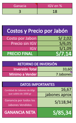 - Cálculos Exactos: Determina el costo de producción de cada jabón basándote en los insumos reales.