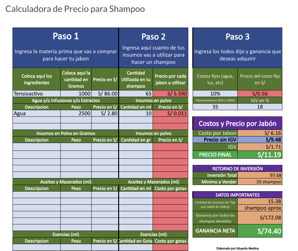 La calculadora de costos es una herramienta que no debe faltar a una jabonera, esta calculadora te ayudará a saber el costo de tu producto y el precio de venta que debería tener cada uno de tus shampoos y acondicionadores Sólidos según los insumos que utilices, olvídate de calcular manualmente con formulas complejas.
